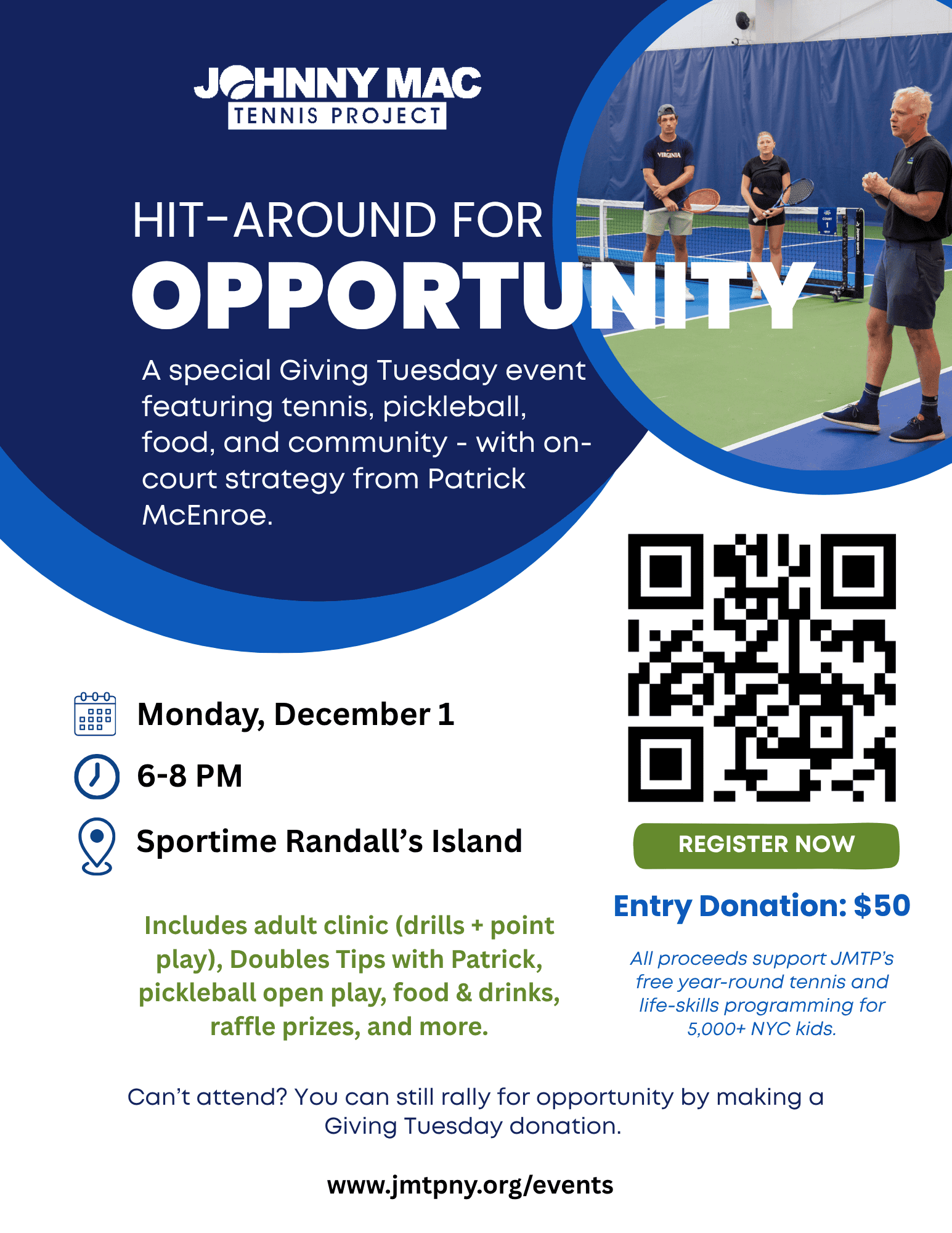 Hit-Around for Opportunity! A special Giving Tuesday event featuring tennis, pickleball, food and community - with on-court strategy from Patrick McEnroe.